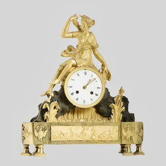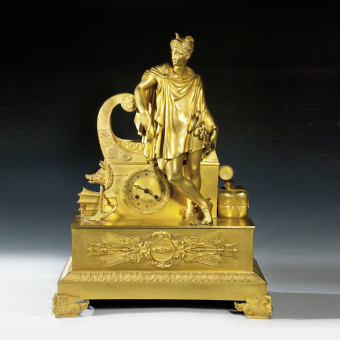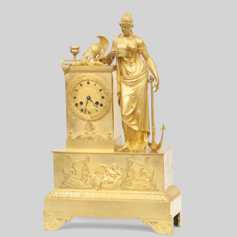 Представленные каминные часы являются классическим образцом великолепных по технике, материалу исполнения и общему гуманистическому смыслу предметом декоративно-прикладного искусства Франции эпохи наполеоновского ампира. Общий художественный дизайн часов разработан как аллегория и символ медицины и ее целительных для человека возможностей. Визуально красивые и идеально скомпонованные в своей скульптурной композиции, насыщенной аллегориями и символами, каминные часы наполнены глубоким внутренним значением, понятными любому образованному любителю искусства. Скульптура и декор этой вещи взывают к нравственному долгу человека и к его помощи другим людям и напоминают одновременно о скоротечности бытия. Чаша со змеей на часовой тумбе-алтаре - это наиболее распространенная в европейской культуре медицинская эмблема. В данном случае змея и чаша фигурируют раздельно и являются атрибутами дочери древнегреческого врача Эскулапа, богини здоровья Гигеи, которая обычно изображалась со змеей в одной руке и с чашей в другой. Истинное значение этой эмблемы остается спорным. Возможно, что чаша со змеей олицетворяла собой лечебные свойства змеиного яда, так широко использовавшегося в древней медицине, и означала сосуд, где хранился змеиный яд. Змея, в свою очередь символизирует мудрость, знание и бессмертие. Якорь, тлеющий, но не погасший факел жизни и ларчик со снадобьями – обретение надежды на выздоровление от ран, полученных в сражениях за родину, т.к. символика мужской доблести и патриотизма скрыта в предметах воинского снаряжения – стрелы, меч, шлем. И последним, весьма многозначительным символом является накладной рельеф на передней панели постамента корпуса – лишь на мгновенье задремавший на цветочной гирлянде амур с луком, символизирующий исцеляющую силу человеческой любви и доверчиво положившийся в данный момент на всемогущую врачебную силу античной богини здоровья. Подобного рода памятники искусства, аккумулирующие в себе нравственно-этические идеалы европейской культуры, переживают своего создателя-мастера и сохраняются на века для будущих поколений.