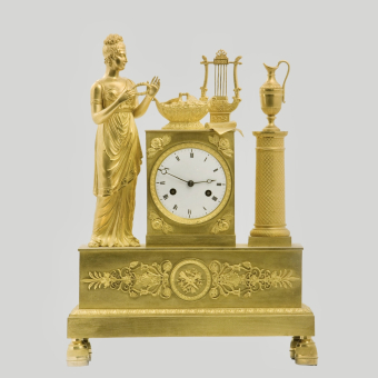 Часы каминные «Гигея» в корпусе из позолоченной бронзы на 4-х фигурных ножках, Франция, первая четверть XIX века.