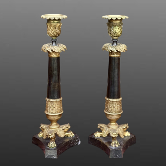 Бра являются характерными образцами русской осветительной арматуры русского ампира в первой четверти XIX века.В композиции бра творчески использован один из самых популярных образов античной мифологии - бог любви Амур (Купидон, Эрот). Античная традиция связывала с Амуром представления о самых глубочайших и сильнейших проявлениях человеческой природы. Сын богини любви Венеры, Амур был представлен в античной лирике, как "златокрылый", "золотоволосый" и "легкокрылый". С изящной легкостью Амур парил над миром людей и богов, поражая любого своими меткими стрелами любви. В осветительной арматуре образ Амура с горящим факелом в руке являлся символ возвышенного чувства пламенной любви.Именно этот образ использован в композиции бра. Причудливая форма основания с ниспускающимся листом аканта, переходящим в изящный завиток, тонкость моделировки ажурного декора, который выглядит особенно эффектно в сочетания в основном поле основания, изящно изогнутые ветви свечников напоминают работы французских бронзовщиков конца XVIII - начала XIX вв., которые нередко включал в композицию светильников фигурки персонажей античной мифологии. Очевидно, что представленные бра являются вольной интерпретацией французского оригинала.