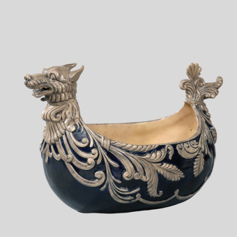 Все предметы декорированы орнаментальными поясами с гирляндами из золотого плюща на благородном сером фоне. В центре тарелок, блюд, внутри чаш и чашек помещены золотые розетки. Рельефные и скульптурные детали покрыты позолотой.