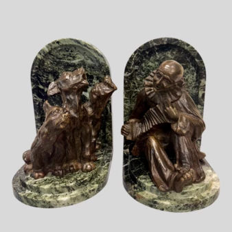 Парные держатели для книг в виде скульптур: играющего на гармони Пьеро и поющих собак, Франция, начало ХХ века, Л. Фонтанель.