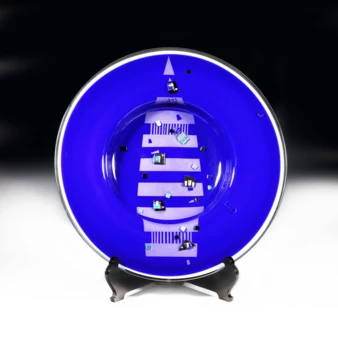 Большое синее блюдо с геометрическим рисунком, Италия, 1991 год.
