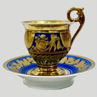 Роскошная чайная пара в стиле ампир с золотым растительным орнаментом, Франция, начало XIX века.