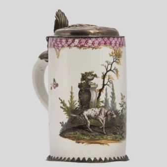Фарфоровая кружка с жанровой росписью на тулове, с серебряной крышкой и серебряной окантовкой края донца, Германия, Саксония, Мейсенская Государственная фарфоровая мануфактура ("Meissener Porzellan"), вторая треть XVIII в. (ориентировочно, 1737-1745 г.)
