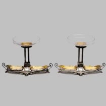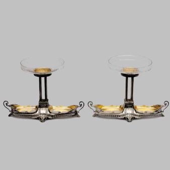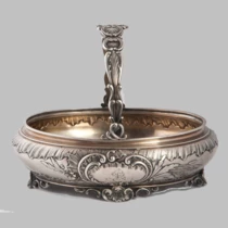 Белый металл, литье, зеркальная полировка, золочение изнутри, кость (вставки на ручках).
