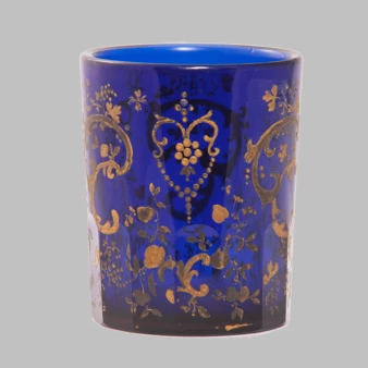 Стекло синее (кобальтовое), шлифованная грань, выдувание, роспись золотом, серебром