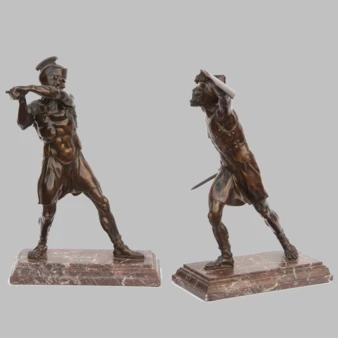 Парные скульптуры «Сражающиеся гладиаторы» из патинированной бронзы на прямоугольных профилированных мраморных подставках.