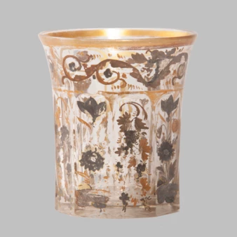 Стекло бесцветное, выдувание, гранение, полировка, роспись золотом, белая эмалевая краска.