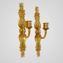 Состоят из позолоченных пластин-основ и накладного литого ажурного декора в форме крупных, симметричных по вертикали, пальметок с завитками, акантовыми побегами и плодами. Центры осветительных приборов выделены круглыми профилированными элементами с выступающими валиками с накаткой и пластическим декором в виде женских головок; над гофрированными тарелочками возвышаются цилиндрические свечники с накаткой в центре в виде "косички". Имеются 2-а отверстия в верхней и нижней части стенников для крепления к стене.