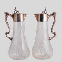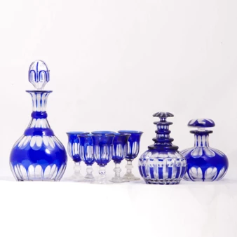 Столовый набор стеклянной посуды ликеро-водочного характера из 9-ти предметов: 6-ть рюмок, большой графин с крышкой и 2-а малых графина с крышками.
