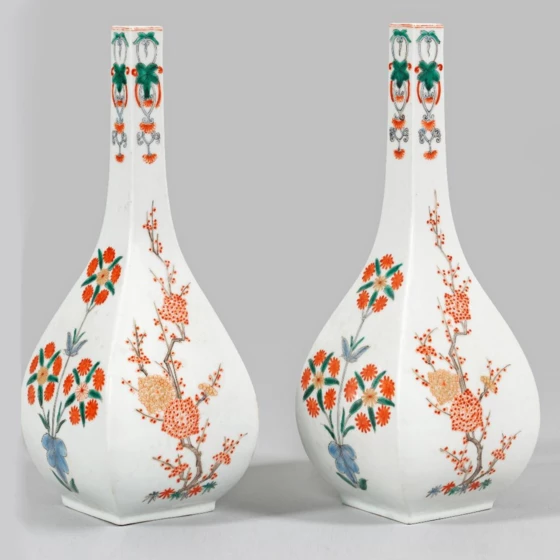 Вазы квадратной формы в виде флаконов, покрыты тончайшей росписью в виде цветущих сливовых деревьев, цветов хризантем в ярких зеленых, золотистых, коралловых и голубых тонах.