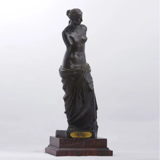 Уменьшенная до размеров интерьерно-кабинетной пластики бронзовая скульптура знаменитого шедевра эллинистической культуры «Венера Милосская» (100 г. до н.э.) отлита на одной из лучших и знаменитых во всем мире парижской фабрике Ф. Барбедьенна (1810 – 1892) . Оригинал этой скульптуры в мраморе высотой 202 см хранится в Музее Лувра. На бронзовой скульптуре имеется фабричное клеймо в виде фамилии Ф. Барбедьенна латинскими литерами и патентное клеймо с профилем и именем инженера-механика Ашеля Колла, изобретателя редукционной машины для изготовления уменьшенных копий с любой статуи. Именно со скульптуры «Венеры Милосской», выставленной в 1837 г. на парижской выставке А. Кола и контракта о совместной работе Барбедьенна и Кола в 1838 г., начала свою работу фабрика, специализировавшаяся на выпуске бронзовых копий античной и средневековой скульптуры, а также скульптурной пластики наиболее известных художников 19 в. Благодаря художественным отливкам фабрики Барбедьенна возник широкий общественный интерес к классическому искусству предшествующих эпох, которое таким оригинальным образом вышло из залов музеев и смогло шагнуть в дом к каждому человеку. К концу 19 в. фабрика Барбедьенна воспроизводила бронзовые скульптуры в четырех размерах - от 17 до 133 см. Крупные копии стоили очень дорого и делались по заказу, а средние и малые тиражировались по каталогу небольшими партиями и продавались в магазинах фабрики. В современном мире, любые бронзовые отливки прославленной французской фабрики имеют высокий статус произведений декоративного искусства.
