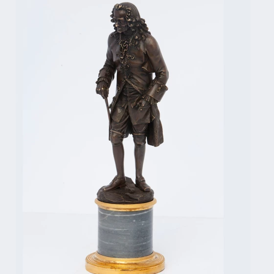 Камерная скульптура «Вольтер на прогулке» из патинированной бронзы отлита по модели выдающегося французского скульптора эпохи классицизма втор. пол. 18 в.Жана-Антуана Гудона (1741-1828), считавшегося одним из самых знаменитых мастеров психологического портрета своего времени. Прославленный скульптор создал целую галереюпортретов своих современников, представителей эпохи Просвещения и деятелей Французской революции.Гудонсильно прославился именно как мастер портретной скульптуры, так как умел с большой точностью передать в материале (гипсе, терракоте, бронзе, мраморе) характерные для того или иного персонажа индивидуальные черты.Одним из шедевров крупнейшего французского скульптора была созданная им в 1781 г. по заказу Екатерины II мраморная статуя "Вольтер, сидящий в кресле", обеспечившая своему автору мировую известность.За свою жизнь Жан-Антуан Гудон создал множество великолепных работ, которые увековечили его имя и до сих пор являются достоянием многих музеев мира и частных коллекций. Бронзовые изделия, созданные в XIX в. парижскими литейщиками по оригинальным моделям Гудона, представляют сегодня значительный интерес с точки зрения коллекционирования. Так и в данном случае, бронзовая скульптура «Вольтер на прогулке» отлита парижскими бронзовщикамив началеXIX в. по модели скульптора 1780-х гг. Вольтер показан гуляющим на прогулке в нарядном уличном костюме, длинном парике, с тростью в правой руке, в левой руке и в правом кармане верхней одежды – рукописные свитки. Его лицо с легкой улыбкой и опущенный к земле взгляд передают углубленное в собственные размышления состояние его философского духа.Для данной работы характерен высокий уровень художественного литья и патинирования, отделка позолоченной бронзой постамента скульптуры еще более подчеркивает историческую значимость изображенного персонажа. Работа имеет антикварное, историко-культурное и художественное значение.
