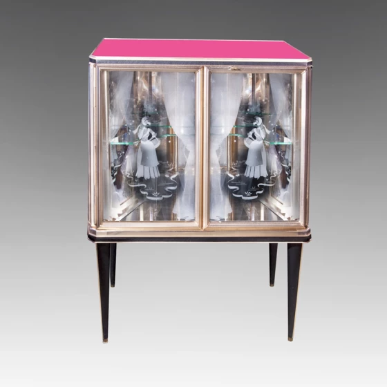 Мобильный коллекционный бар, интересный образец итальянского дизайна, спроектированный Умберто Масканьи из Болоньи в 1950-х годах. Основная конструкция изготовлена из европейского массива дерева, покрыта винилом красного цвета с анодированным алюминием, дверцы декорированы четырьмя стеклянными панелями, выполненными в технике травления.