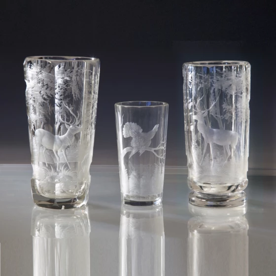 Набор из 3-х стаканов с сюжетами дикой природы, Богемия (Чехия), фирма "Мозер" ("Moser"), 1880-е гг., Иоганн Ф. Хоффанн (Johann F. Hoffmann)