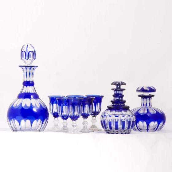 Столовый набор стеклянной посуды для крепких напитков является типичным образцом вещей русского домашнего обихода городского дворянского дома или сельской усадьбы второй трети 19 в. Яркая кобальтовая окрашенность стеклянных предметов, сложная форма и богатый декор их внешней поверхности делают их декоративным украшением стола и напоминают о эпохе историзма в России и одном из его излюбленных художественных ретростилей - неорококо, отличающемся прихотливостью форм, фантазийностью декора и оригинальным дизайном утилитарно-бытовых вещей.
