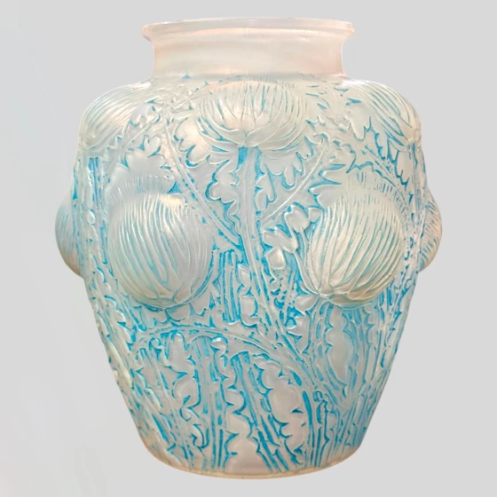 Ваза "Domremy" является одной из самых известных ранних моделей Рене Лалик. Была создана в 1926 году и выпускалась до 1932 года. Имеет рельефный декор в виде цветов чертополоха. Опалесцентное стекло придает вазе эффект сияния и многоцветия.