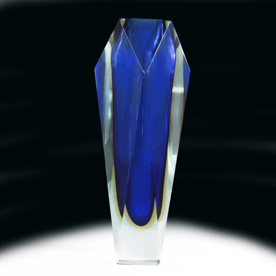 Ваза геометрической формы в кобальтовом цвете изготовлена в технике соммерсо. Насыщенный глубокий синий цвет изделия переходит в золотистое свечение граней. Техника “sommerso” в переводе с итальянского означает погружение. Эта трудная, сложная техника позволяет добиться впечатляющего трехмерного эффекта и осветить внутреннюю часть стеклянной массы. Это создает иллюзию глубины и дополнительное свечения между слоями стекла.