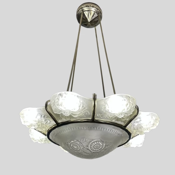 Люстра в стиле ар-деко является уникальным произведением мастера по стеклу Мариуса Эрнеста Сабино. Состоит из восьми стеклянных панелей с цветочными мотивами, охватывающими центральный плафон с полированными поверхностями.