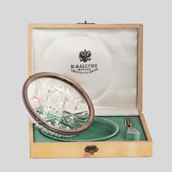 Белый металл, хрусталь, резьба, шлифовка. Футляр - дерево, бархат, атлас, штамп.