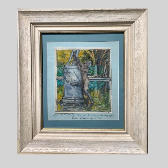 Данная работа исполнена А.Н. Бенуа для издания романа Рене Буалева «Урок любви в парке», вышедшего в Брюссельском издательстве «Aux Editions du Nord» в 1927 году. В книгу вошли черно-белые тушевые рисунки А.Н. Бенуа, мастрески и виртуозно им исполненные. К сожалению, того успеха, на который рассчитывал А.Н. Бенуа, они ему не принесли, хотя художник рассчитывал на дальнейшие книжные заказы. По всей видимости, данная работа, раскрашенная акварелью, является одним из первых вариантов, нарисованных А.Н. Бенуа для романа Буалева.