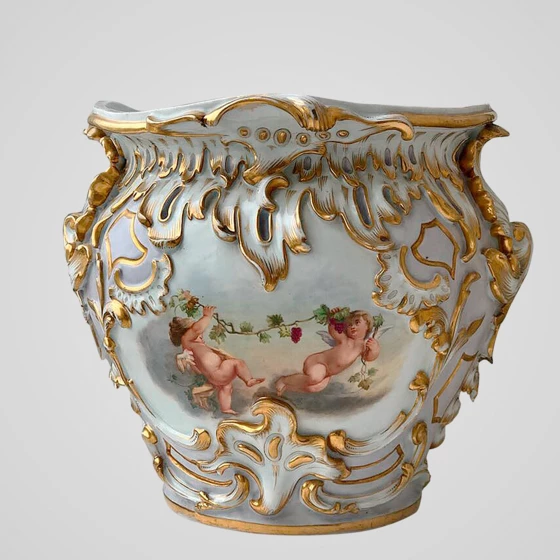 Данное кашпо выполнено в традициях рокайльной стилистики XVIII века. Очень трудоемкое и многодельное по обилию деталей и способов декорирования изделие. С двух сторон на тулове в фигурных резервах – полихромные изображения играющих путти с виноградной лозой и пальмовыми листьями.