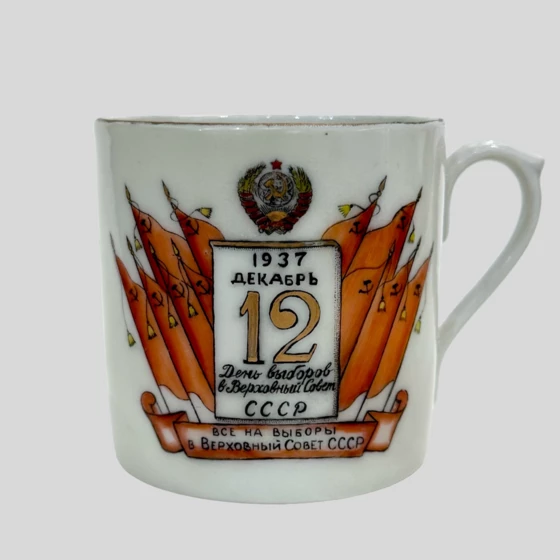 Кружка "Все на выборы в Верховный Совет", СССР, Дулёвский фарфоровый завод ("Дулёво"), 1937 год.