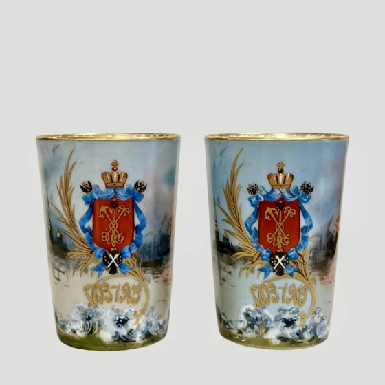 Эксклюзивный набор из двух стаканов в честь двухсотлетия Санкт-Петербурга, Россия, завод "Братьев Корниловых", 1903 год.
