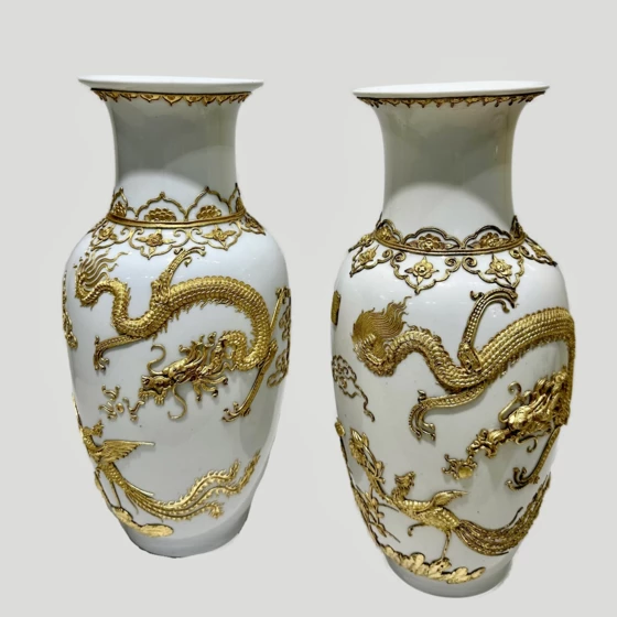 Это великолепные китайские вазы Blanc de Chine ручной работы с филигранными драконами из 24-каратного золота. Белый фарфор с невероятными драконами из золотой филиграни.