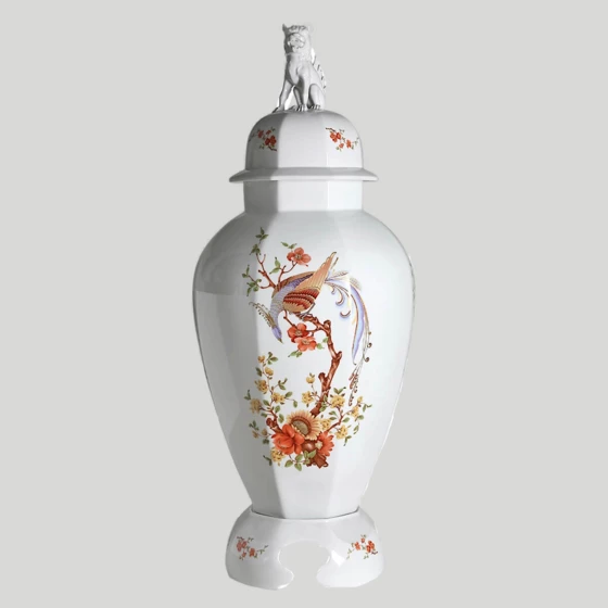 Ваза «Райская птица на ветке» декорирована фигурой павлина на цветочной ветке, символизирующего счастье и благополучие. Орнамент вазы состоит из разнообразного букета из цветов граната и подсолнуха. Крышка вазы украшена скульптурным изображением китайского дракона, являющегося символом удачи, процветания и мудрости.