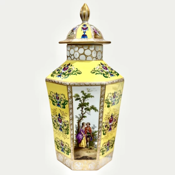 Ваза с галантными сюжетами, Германия, Дрезден, Саксонская фарфоровая мануфактура ("Sächsische Porzellan-Manufaktur Dresden GmbH", "Saxon Porcelain Manufactory in Dresden, Ltd"), XIX век.