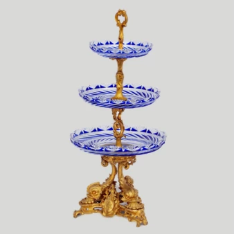 Бесцветный хрусталь, с кобальтовым надцветом, гранение, бронза, литье, чеканка, золочение.