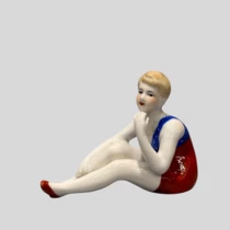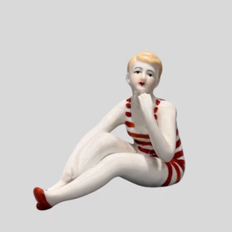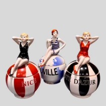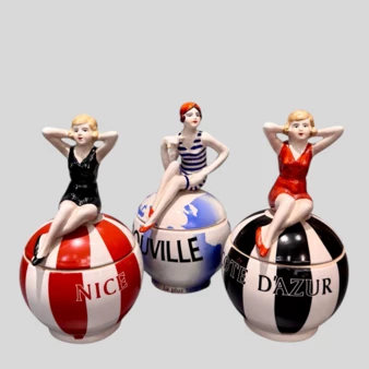Комплект из 3-х шкатулок в стиле ар-деко, в виде сидящих на шаре купальщиц, Франция, 1920-годы.