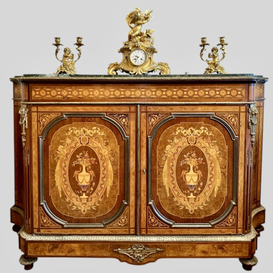 Представленный комод эпохи Наполеона III исполнен в технике "маркетри" и декорирован бронзовыми деталями.