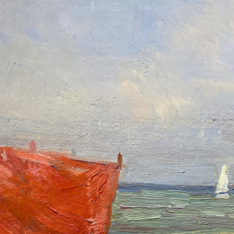 Линей горизонта художник изображает основной план - море и песчаный пляж, освещенный солнцем. В правой части можно увидеть знаковую для художника деталь- яркие желтые и голубые зонты и фигуры людей.