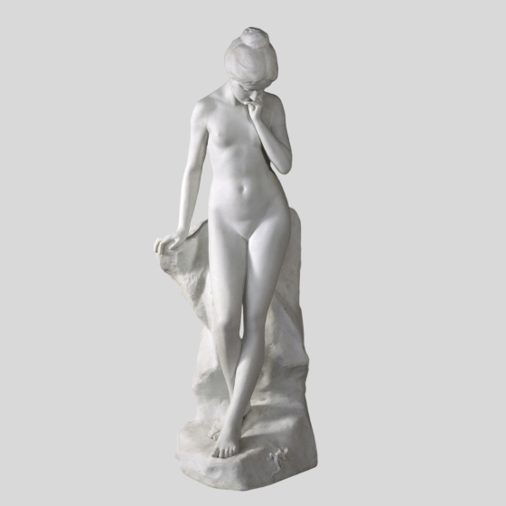 Автор скульптурной модели – известная в России и единственная профессиональная женщина-скульптор эпохи модерна Мария Львовна Диллон (1858-1932), работавшая в области аллегорической, портретной, мемориальной и декоративно-прикладной скульптуры. Ее наиболее известные работы связаны с созданием сентиментальных и романтических женских и детских скульптурных образов, которые становились широко известными благодаря активному участию художницы на всех крупнейших выставках в России и за рубежом. М.Л. Диллон создала целый ряд моделей камерной декоративной скульптуры для Императорского фарфорового завода в Санкт-Петербурге, которые выпускались в глазурованном фарфоре и бисквите. Во многих случаях, это были обнаженные женские фигуры в художественной манере позднего русского академизма вторая половина XIX века и модерна рубежа XIX-XX века. Скульптурная лепка «Юности» выполнена с большим натурализмом и характеризуется высоким уровнем профессионально-технического исполнения, тщательной проработкой фактурных деталей и великолепной свето-теневой моделировкой пластических объемов. На обороте подставки скульптуры имеется зеленая марка штампом – «Н II» под короной с датой «1913» и метка формовщика модели «А. Лукин», с внешней стороны подставки - авторское факсимиле «М. Диллон». Из архивных данных известно, что интерьерные скульптуры из фарфора или бисквита высотой более 50-70 см очень сложны в производстве и в начале XX века исполнялись на Императорском фарфоровом заводе в единичных экземплярах без какого-либо широкого тиража. Работы М.Л. Диллон, выполненные в мраморе, бронзе и чугуне хранятся в нескольких российских музеях - Государственном Эрмитаже, Русском музее, Третьяковской галерее, Екатеринбургском музее изобразительных искусств. Для российского антикварно-художественного рынка скульптура «Купальщица» является большой редкостью.