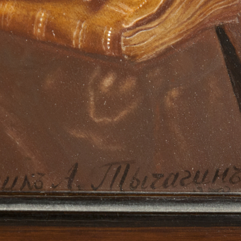 В правом нижнем углу черная надглазурная подпись исполнителя росписи: "Ученик А.Тычагин. 1838."
